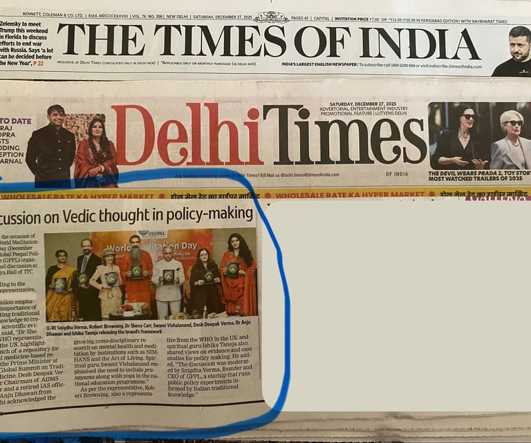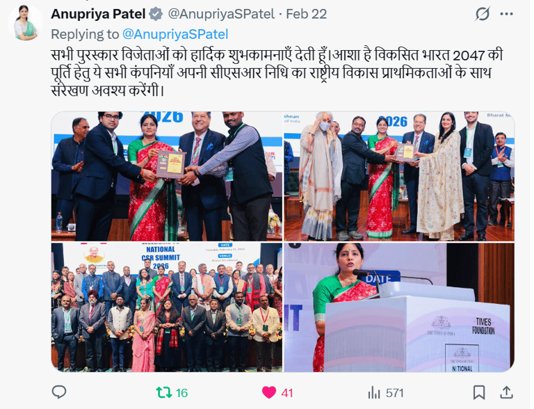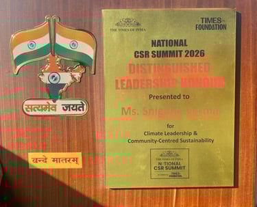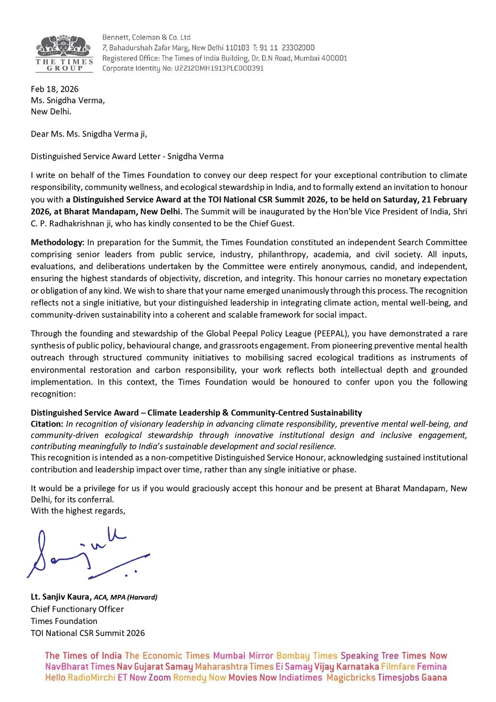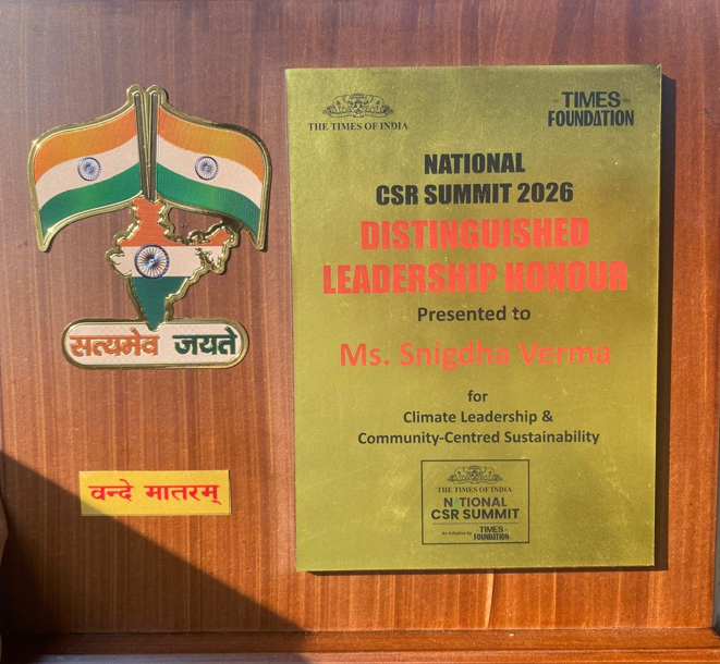In the presence of Hon'ble Vice President of India, Shri VP Radhakrishnan, CEO GPPL felicitated by the Hon'ble Minister of State for Health & Family Welfare, Smt. Anupriya S. Patel, with Distinguished Service Award - Climate Leadership & Community-Centred Sustainability at the Times of India Foundation event in 2026.